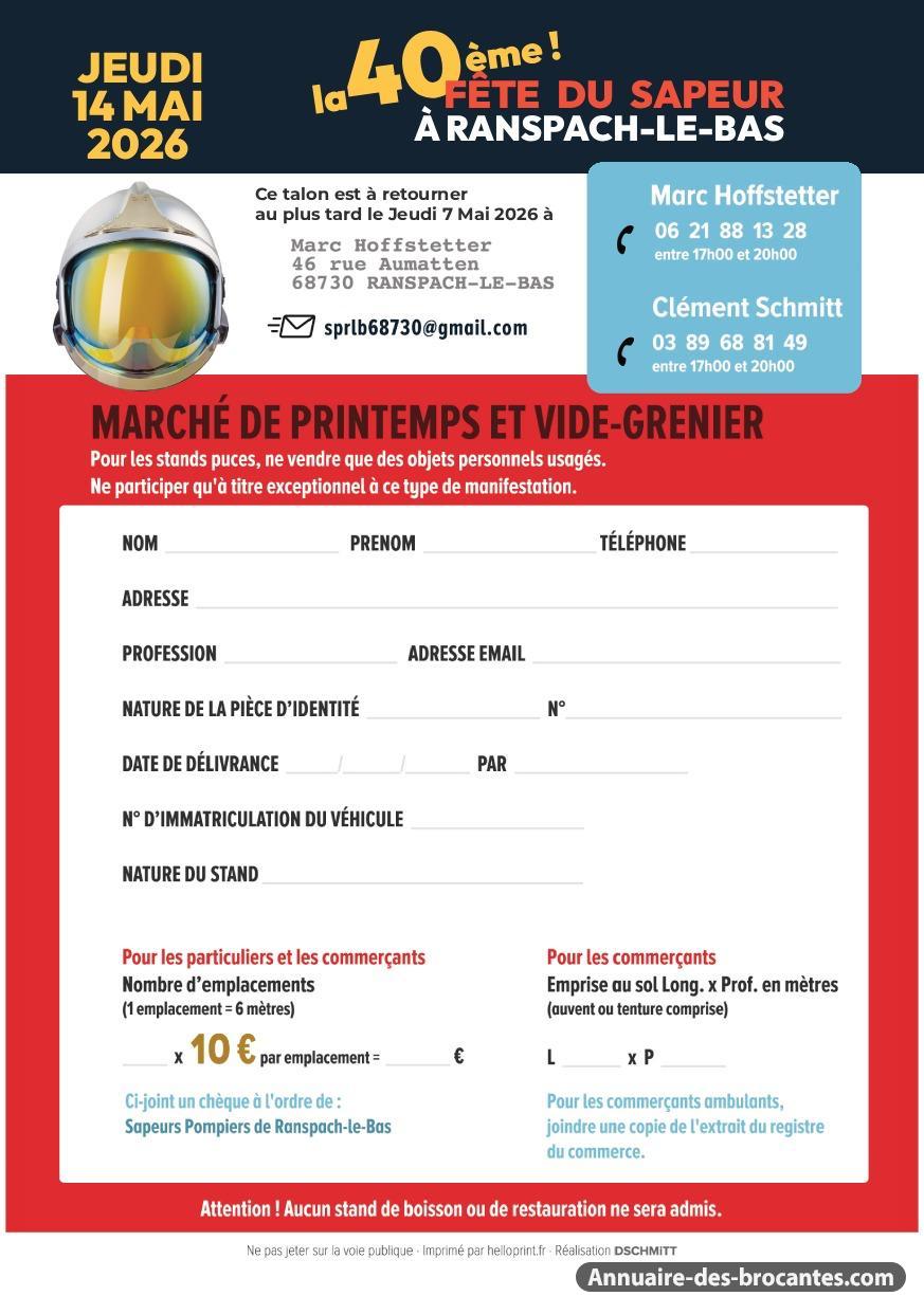 l’amicale des sapeurs-pompiers de ranspach-le-bas vous invite à célébrer la 40e édition de la fête du sapeur, accompagnée de son marché de printemps et de son vide-grenier. Cet événement convivial en alsace rassemble chaque année habitants et visiteurs autour d’animations, de restauration et de nombreux exposants.